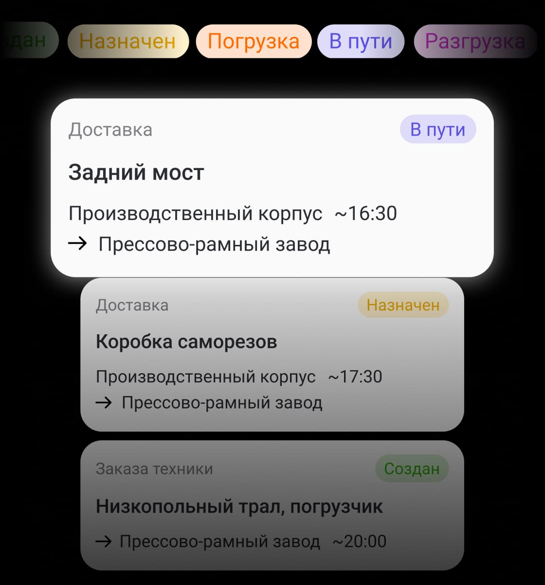 Компактные, но при этом читабельные плашки заказов имеют все необходимые данные для быстрого считывания статусов и помечены понятными бейджами
